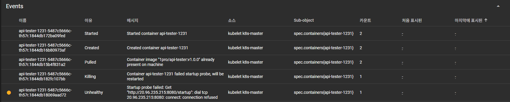 Pod의 Events 내용을 확인해보면 startupProbe의 failureThreshold 값 1만큼 실패하는 경우 앱을 계속 재기동 하는 것을 확인할 수 있습니다.
