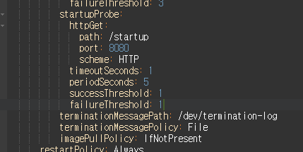 deployment의 startupProbe의 failureThreshold 값을 1로 변경합니다.