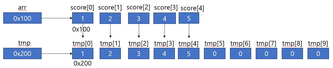 score[3] = 100; // 배열 score의 4번째 요소에 100을 저장한다.