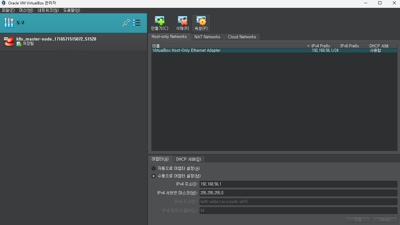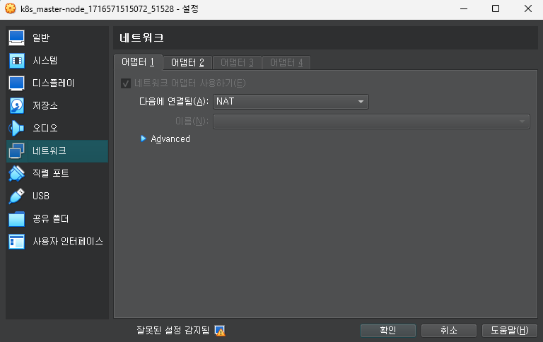 Virtualbox 실행 > k8s_master-node 마우스 우클릭 > 설정 > 네트워크 > 어댑터 1