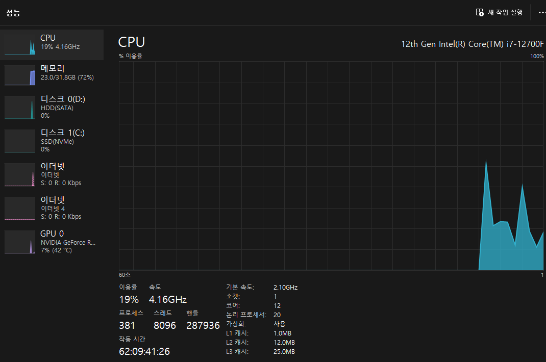 > 윈도우 하단 상태바 우클릭 > 작업관리자 > 성능 탭
