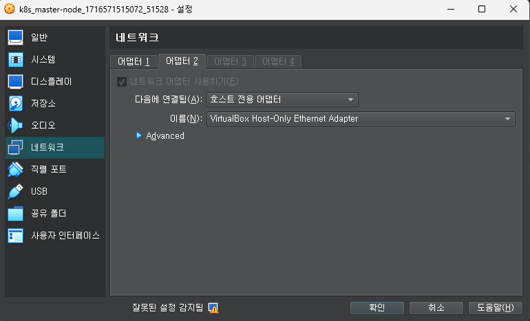 Virtualbox 실행 > k8s_master-node 마우스 우클릭 > 설정 > 네트워크 > 어댑터 2
